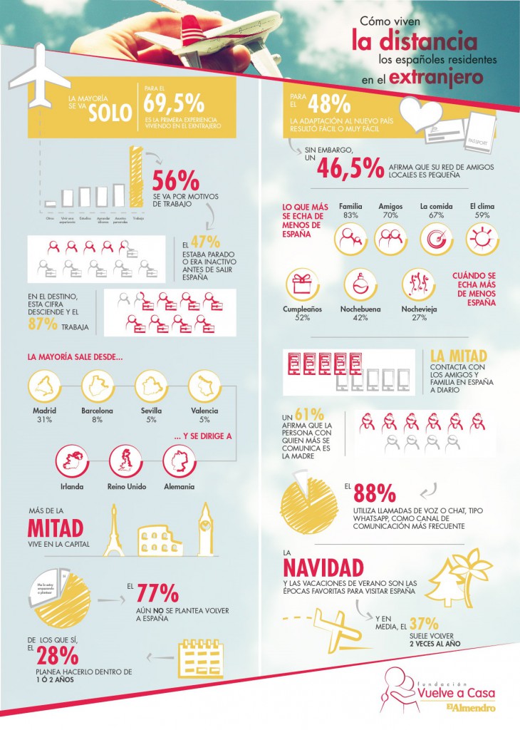 La recién creada Fundación Vuelve a Casa-El Almendro ha publicado el informe ¿Cómo viven la distancia los españoles que residen en el extranjero? con el objetivo de analizar y conocer cómo viven los expatriados españoles. A continuación, desglosamos los resultados.