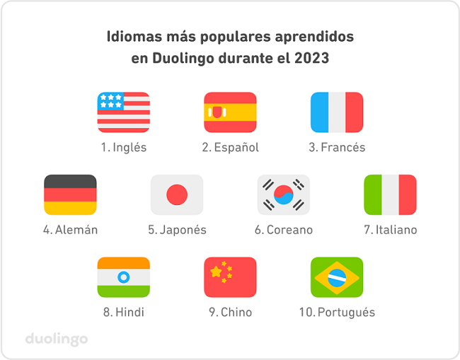 En el TOP 10 del aprendizaje de idiomas que lidera el inglés, se sitúan, por este orden, el español (que se aprende en un total de 34 países), el francés, el alemán y el japonés en primeras posiciones. Destaca el coreano en sexta posición, por delante del italiano, el hindi, el chino y el portugués. De hecho, el coreano aparece en el TOP 10 de países como India, donde su interés ha crecido un 75% en solo un año.